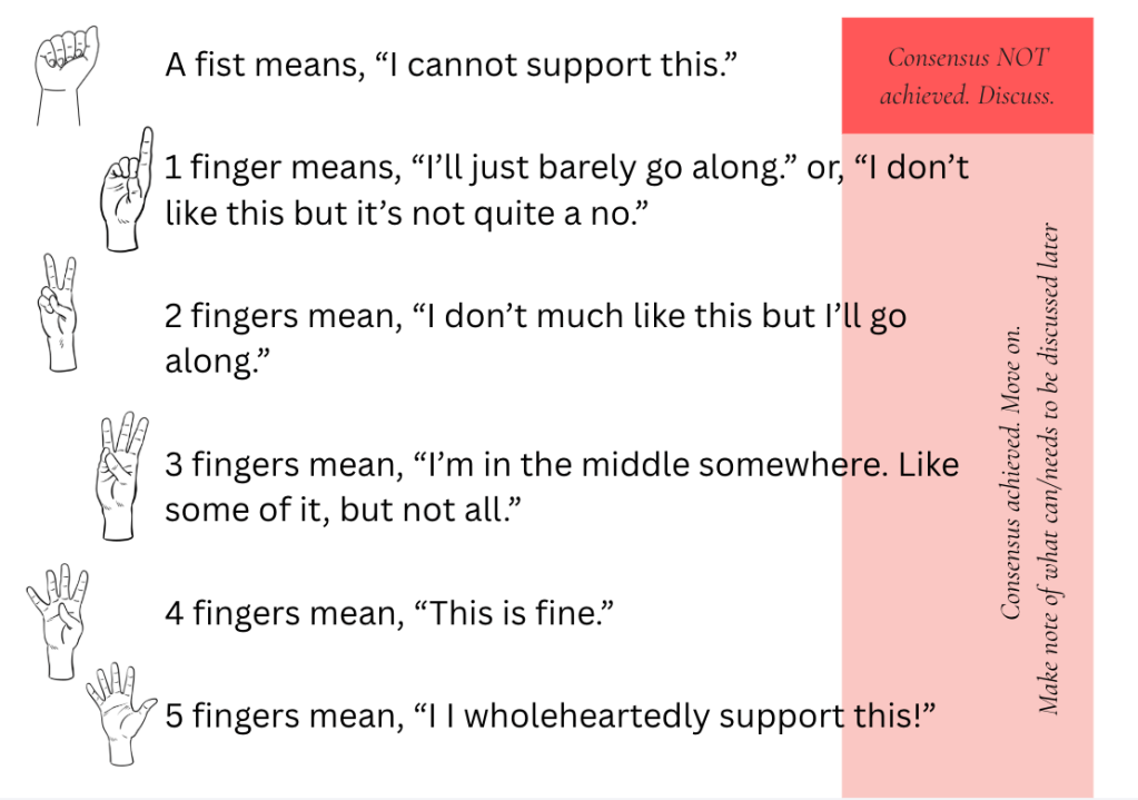 3×5 Card (Front and Back): Coming to Consensus (Fist-to-Five Decision Making)